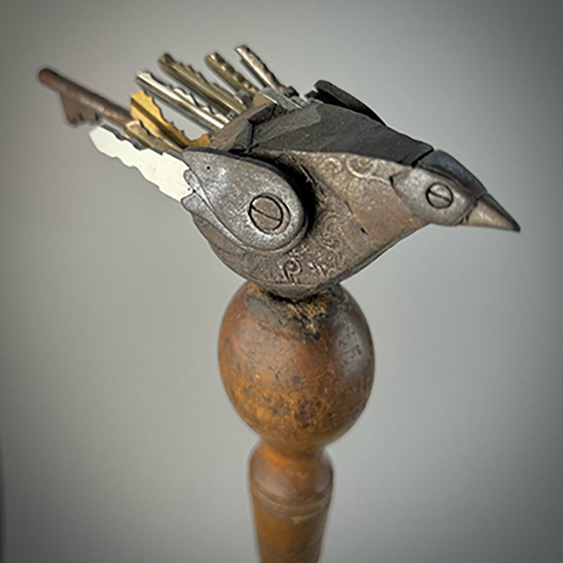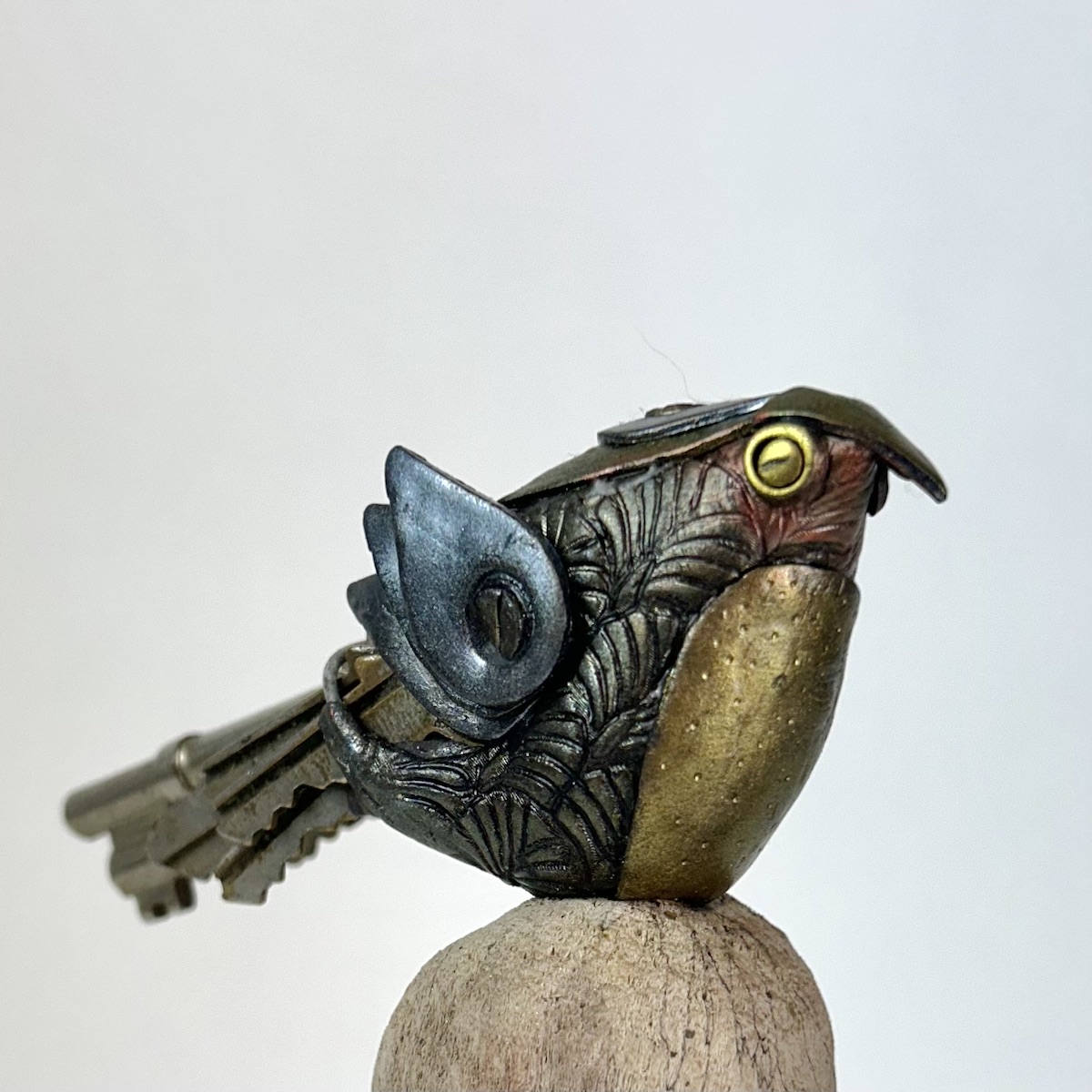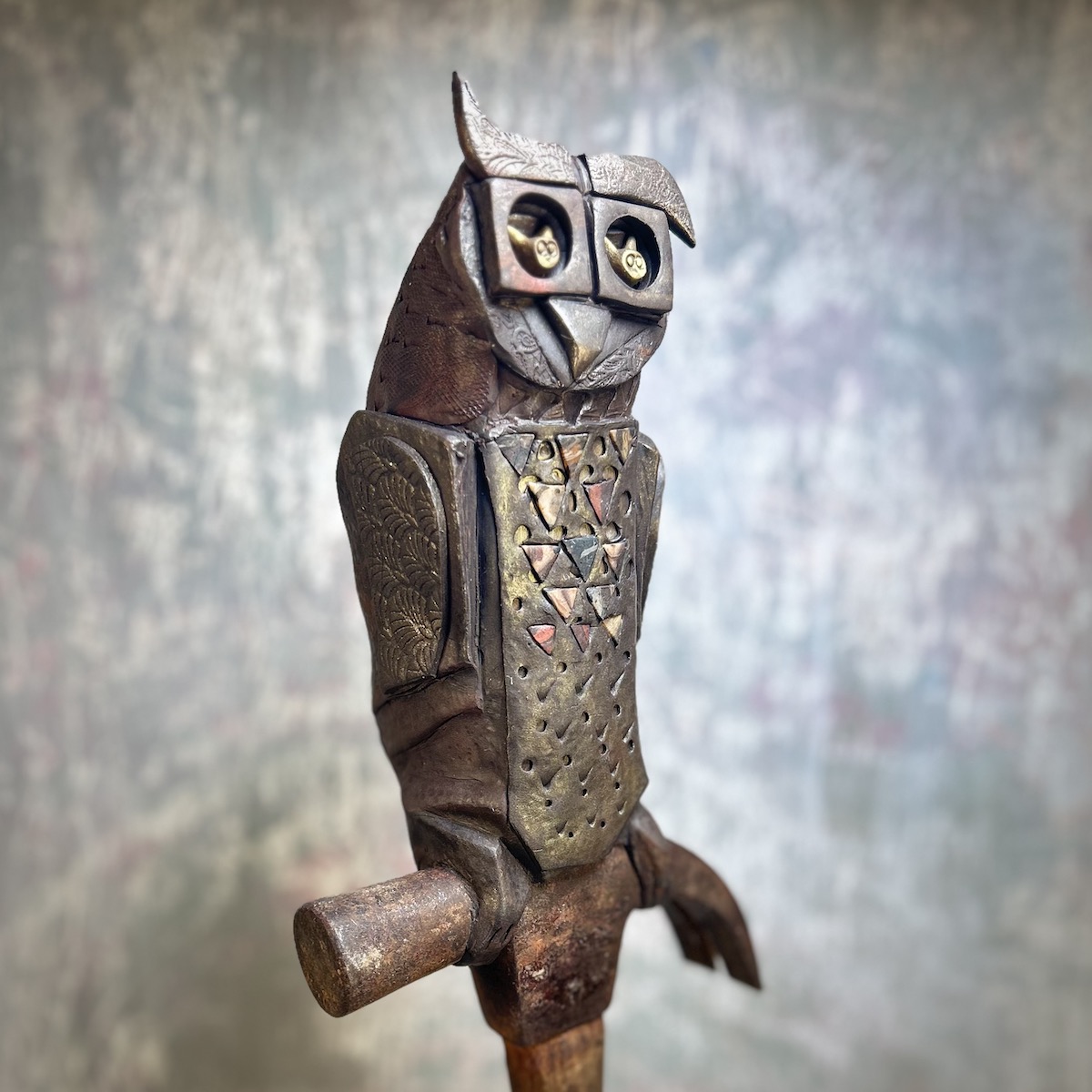 Layers of embossed polymer clay form the body for this owl, perched upon a reclaimed hammer. Using various gilding techniques to create an industrial finish.