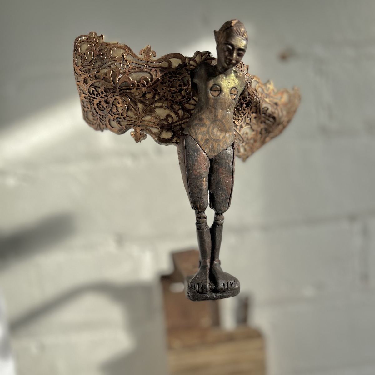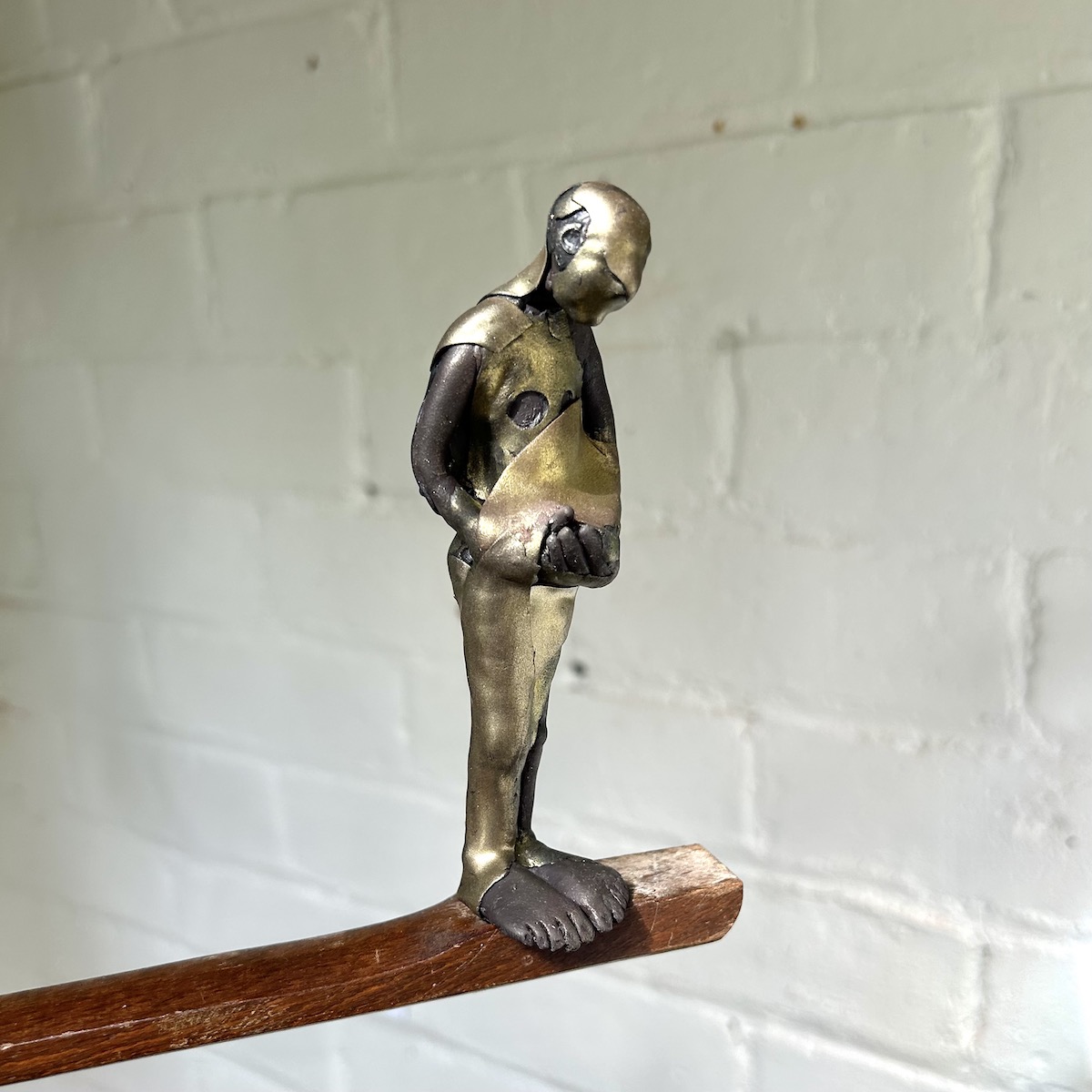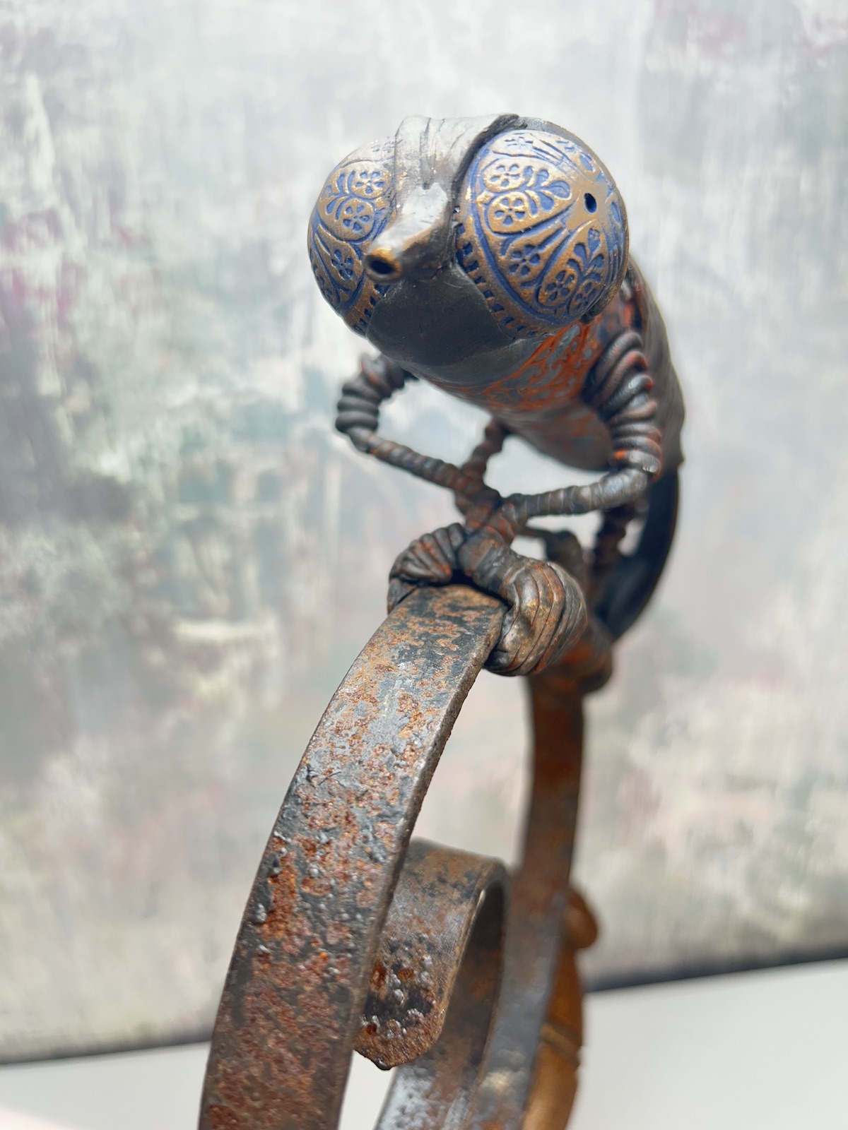 Layers of embossed polymer clay form the body for this owl, perched upon a reclaimed hammer. Using various gilding techniques to create an industrial finish.