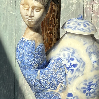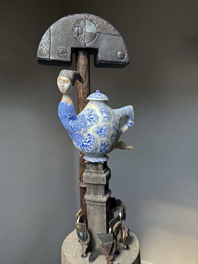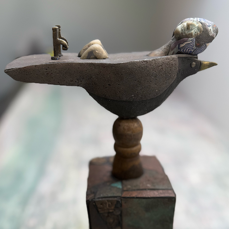 Birdbath is a polymer clay sculpture featuring a figure bathing in a tub, shaped like a black bird. The work sits on a mosaic-style base of patchwork panels, each created with embossed metallic polymer clay in varied finishes.