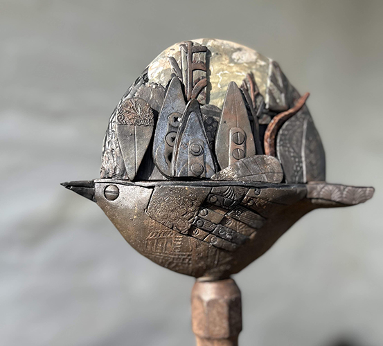 Embossed layers of polymer clay form the body for this owl, perched upon a reclaimed hammer, using various gilding techniques to create an industrial finish