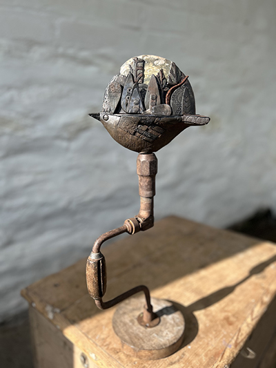 A reclaimed hand Brace drill forms the base for a blackbird in landscape, sculpted in embossed layers of polymer clay.